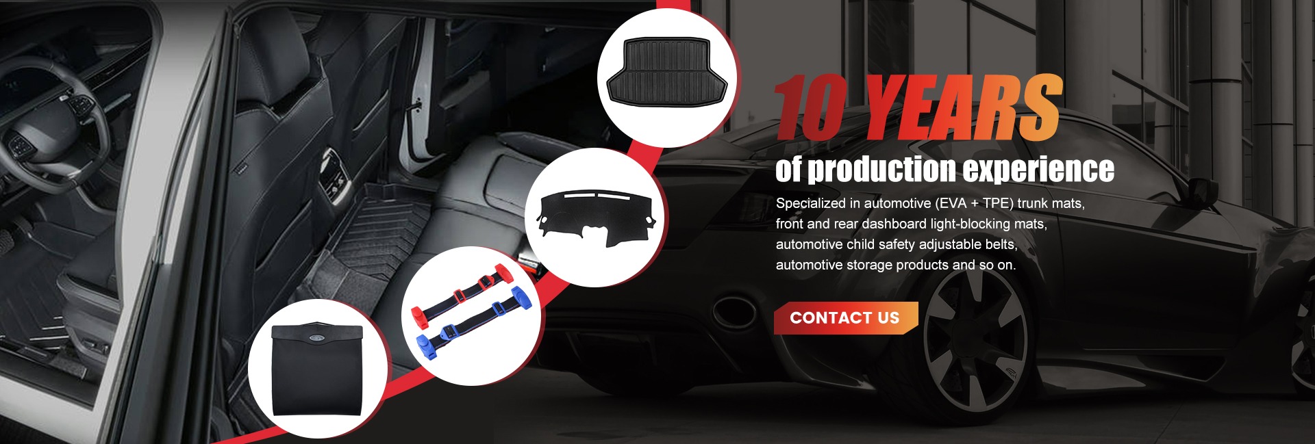 Productos principales:Alfombrilla para maletero de coche, cojín para maletero de coche, almohadilla para sombreado de salpicadero automotriz, ajustador de cinturón de seguridad de coche, bolsa de almacenamiento de coche